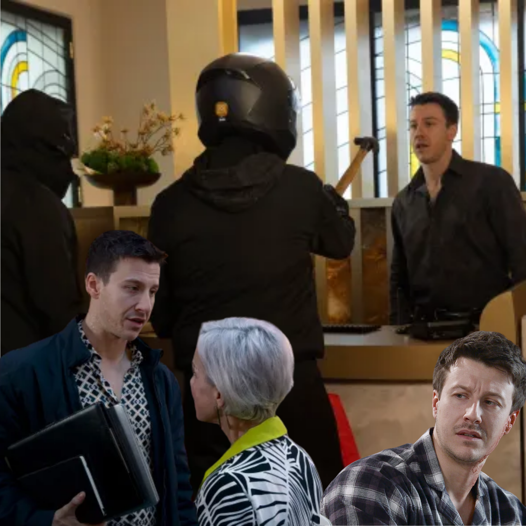 At the Chariot Square Hotel, two masked robbers approach Ryan in reception. When one of them pulls out a claw hammer and orders him to open the safe, Ryan freezes with fear. Having stuffed the contents of the safe into a bag, the robbers attack Ryan.